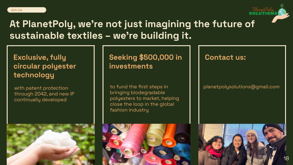 PlanetPoly Solutions is a sustainable materials startup founded on biodegradable polymer innovation, aiming to reduce plastic waste and drive a more circular economy. The company’s mission is rooted in environmental stewardship, responsible production, and sustainable design, with a goal of achieving B Corp certification.